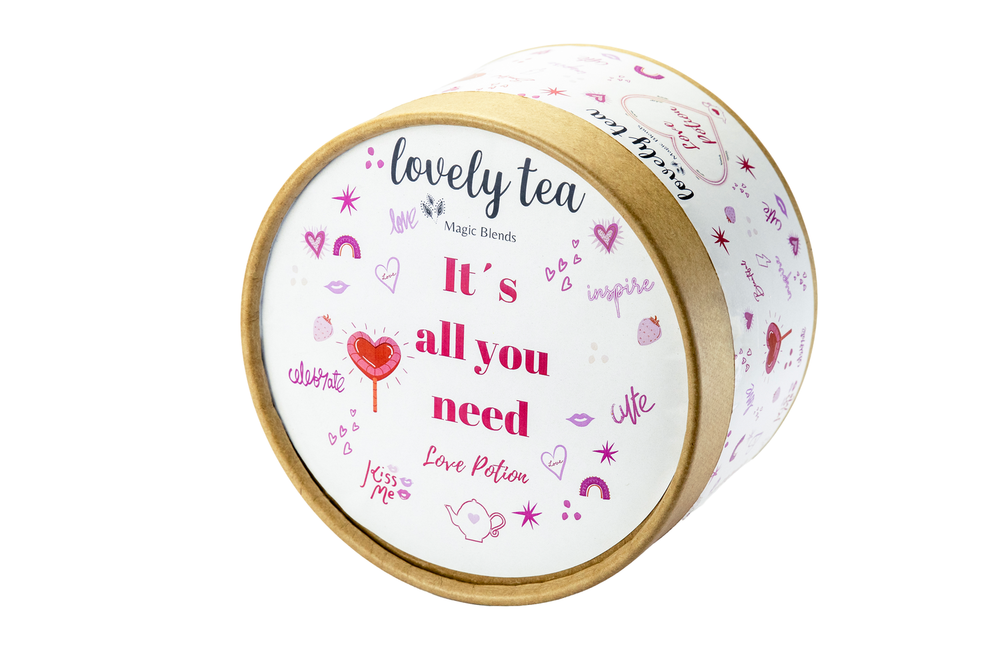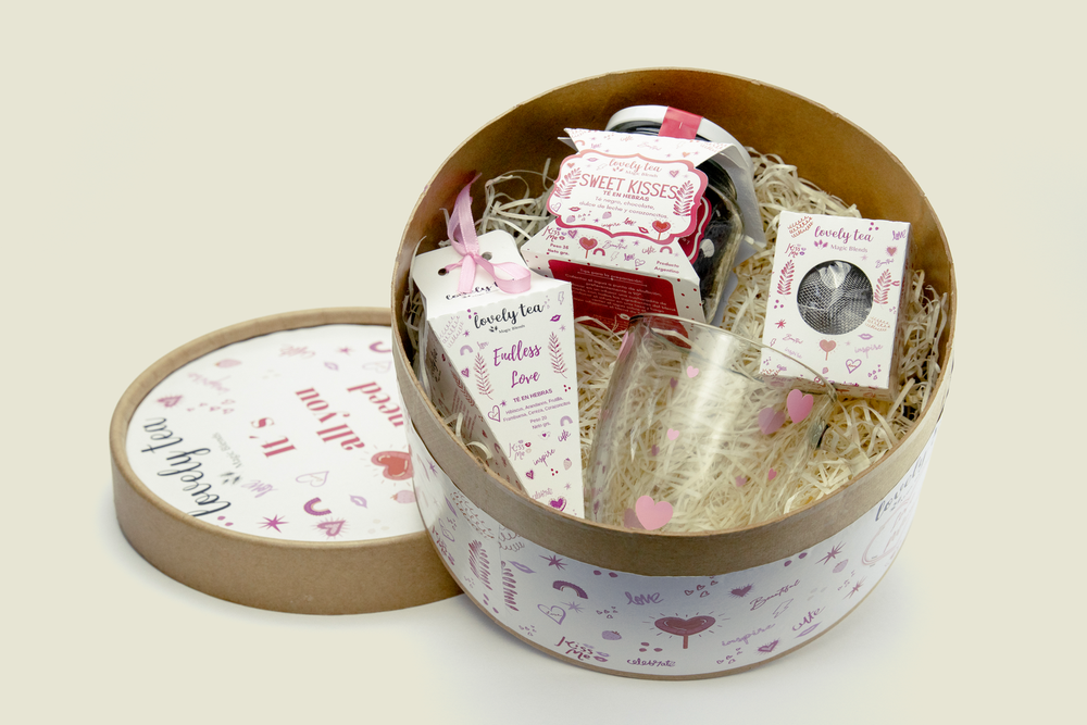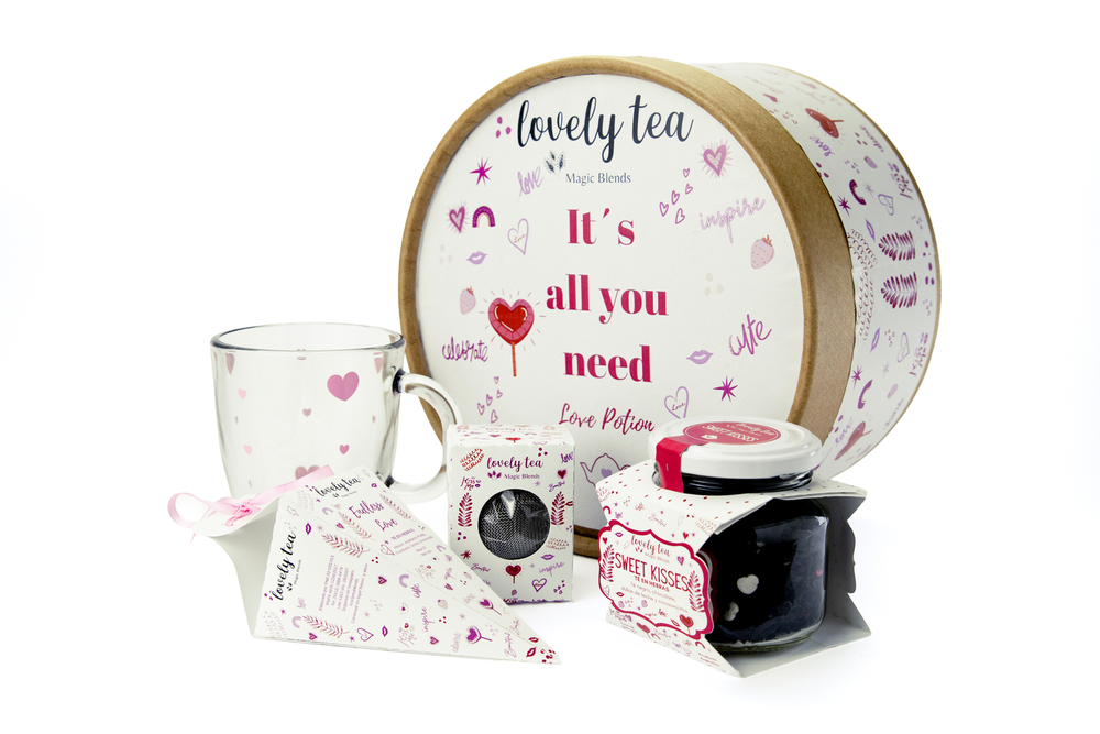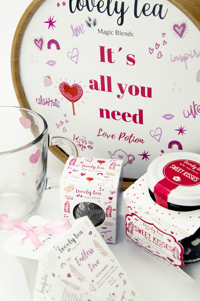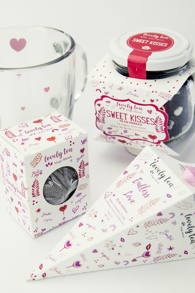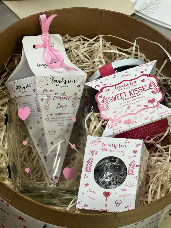 CONO ENDLESS LOVE: HIBISCUS , ARANDANO, FRUTILLA, FRAMBUESA, CEREZA, CORAZONCITOS. FRASCO SWEET KISSES: TE NEGRO, CHOCOLATE, DULCE DE LECHE, CORAZONCITOS. INFUSOR TAZA
